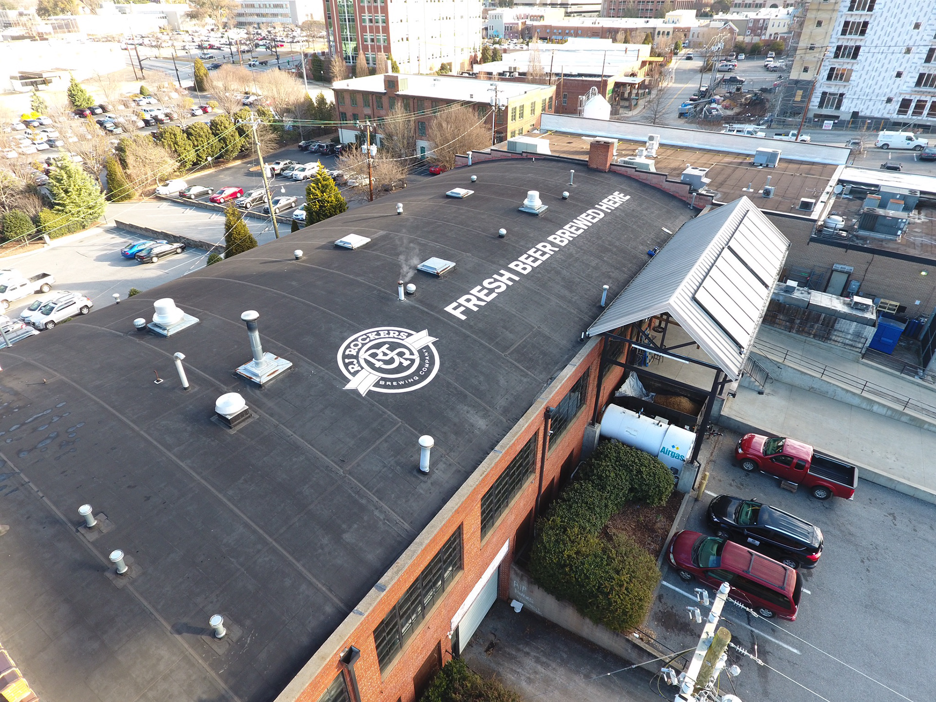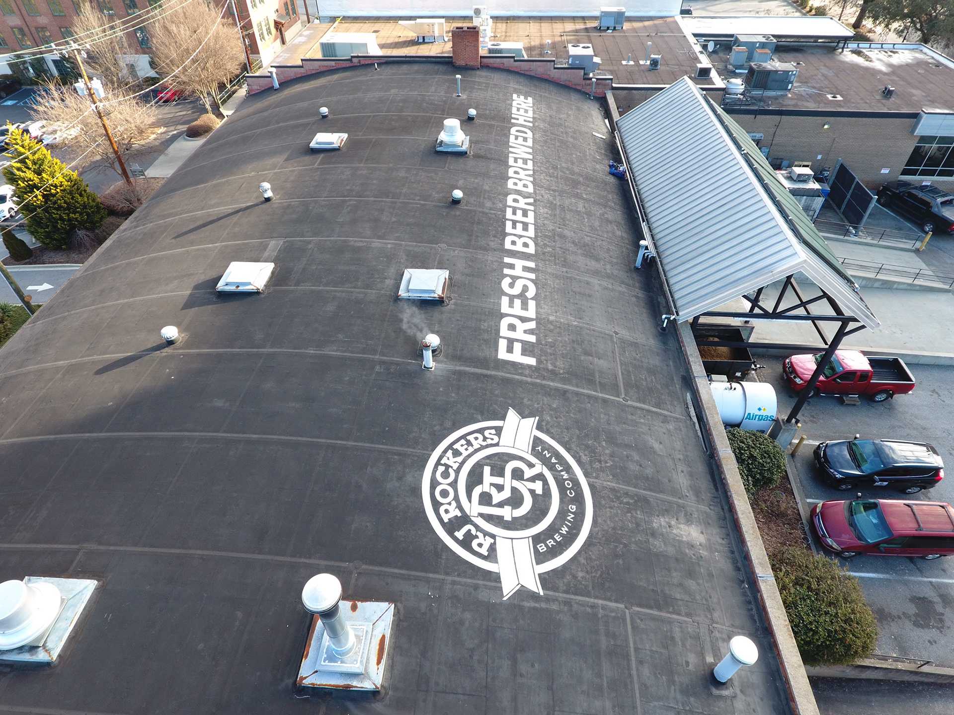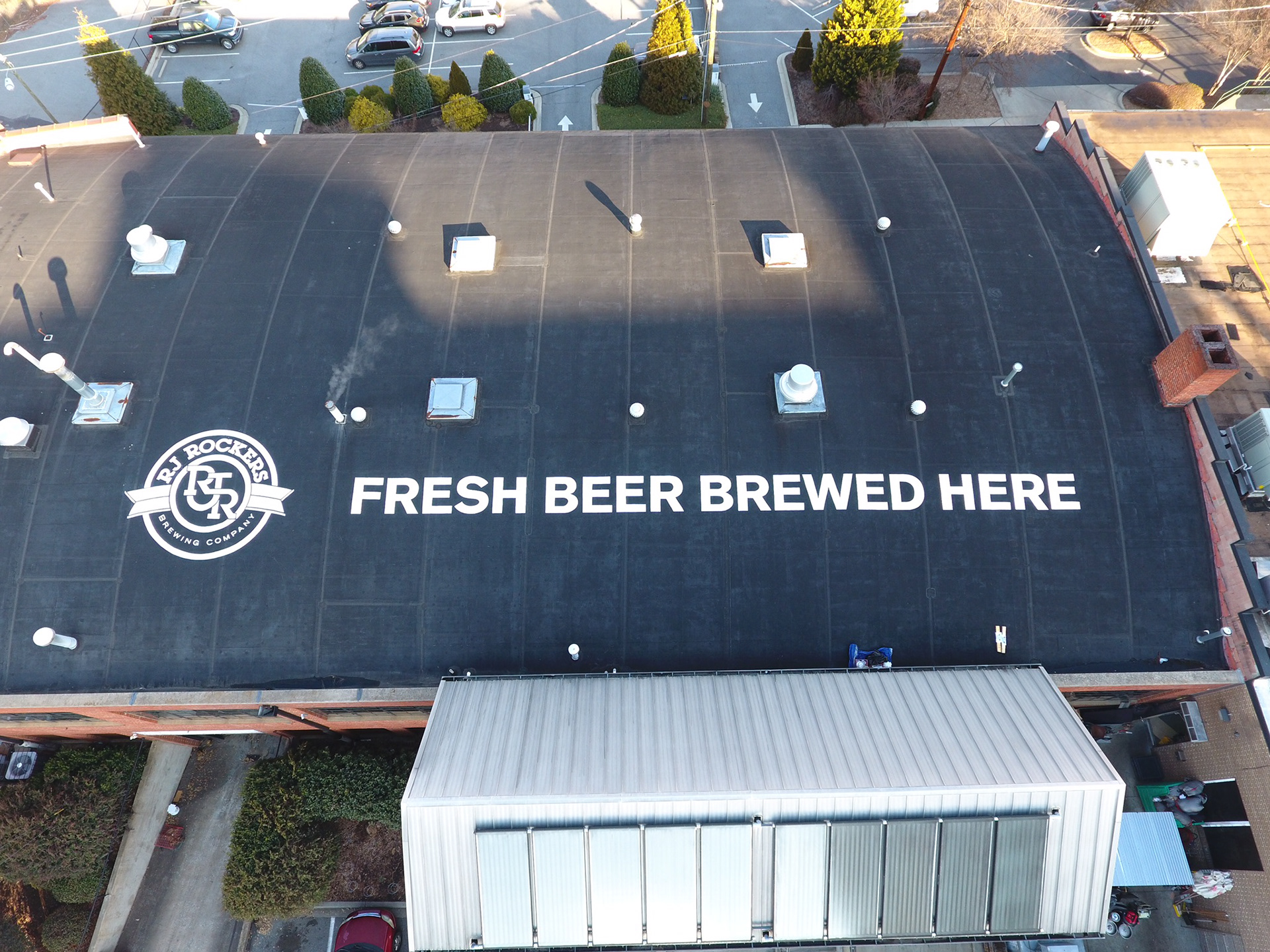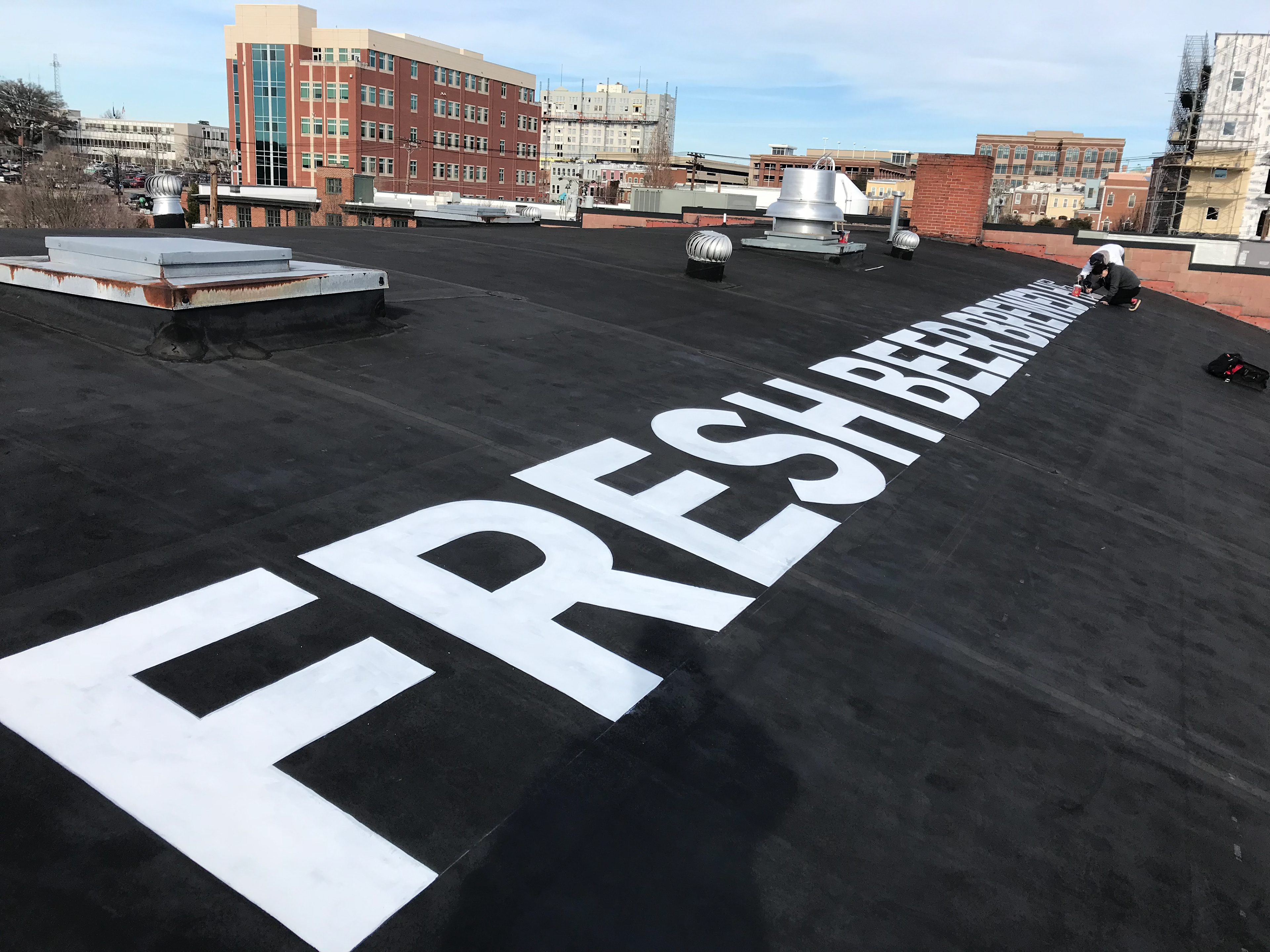 RJ Rockers Brewing company commissioned Bannan Blasko to execute this bold graphic designed by Launch Something. Viewable to guests at the newly constructed AC Hotel by Marriott Spartanburg across the street. The crisp text proudly announces to patrons and guest: “FRESH BEER BREWED HERE.” PHOTO/VIDEO CREDIT: Gabe Porter